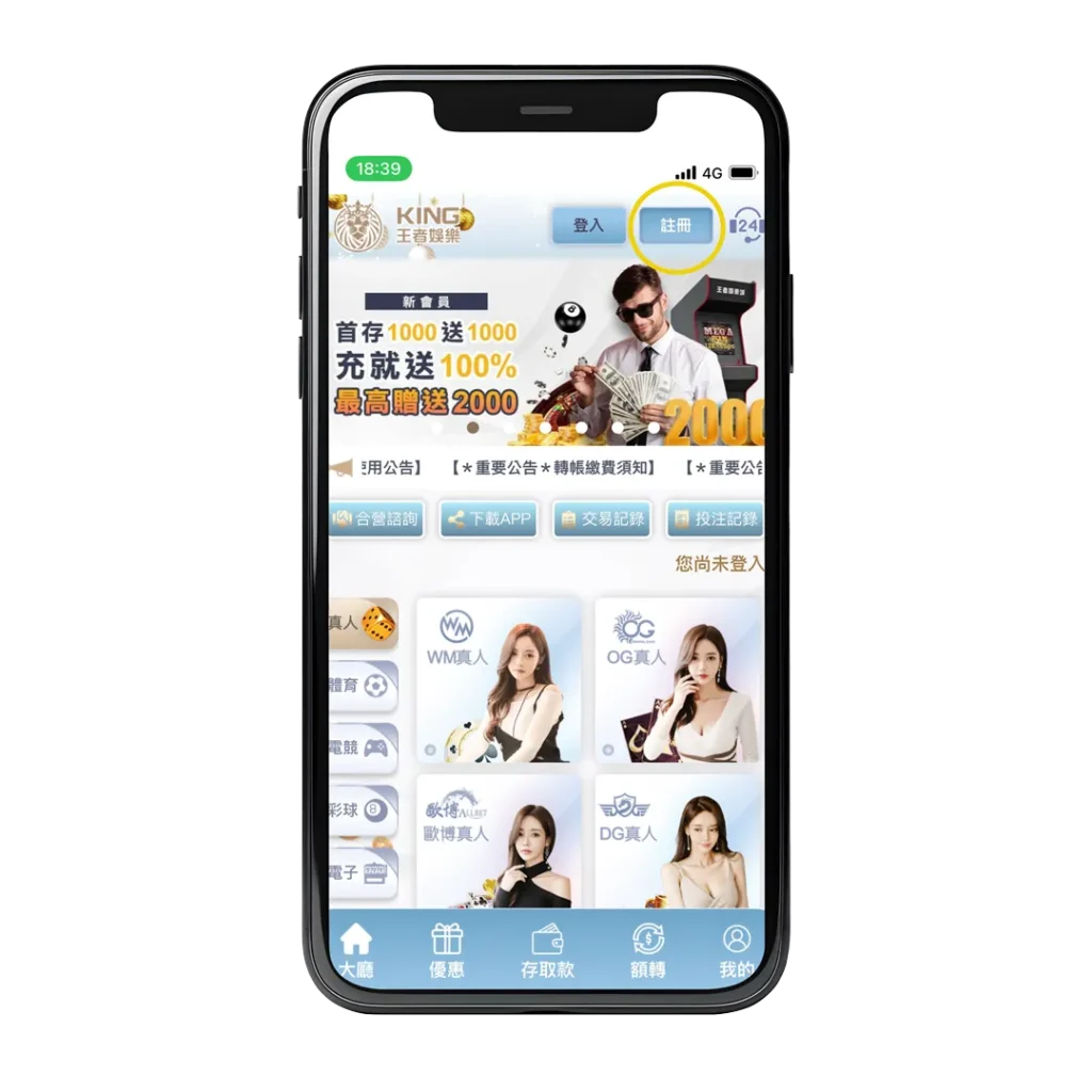 step1.點選手機桌面的「大老爺娛樂城app」,點擊「註冊」